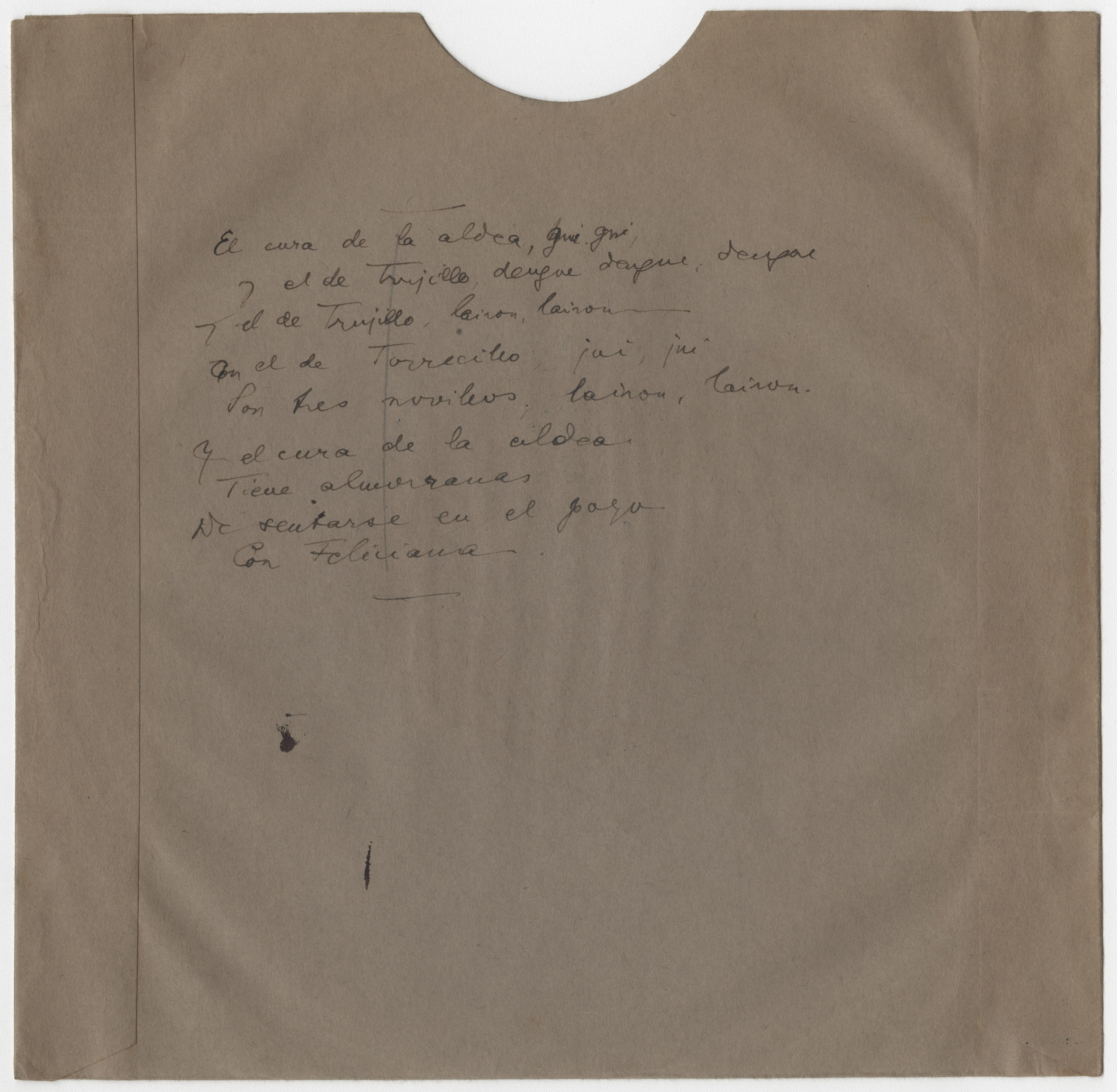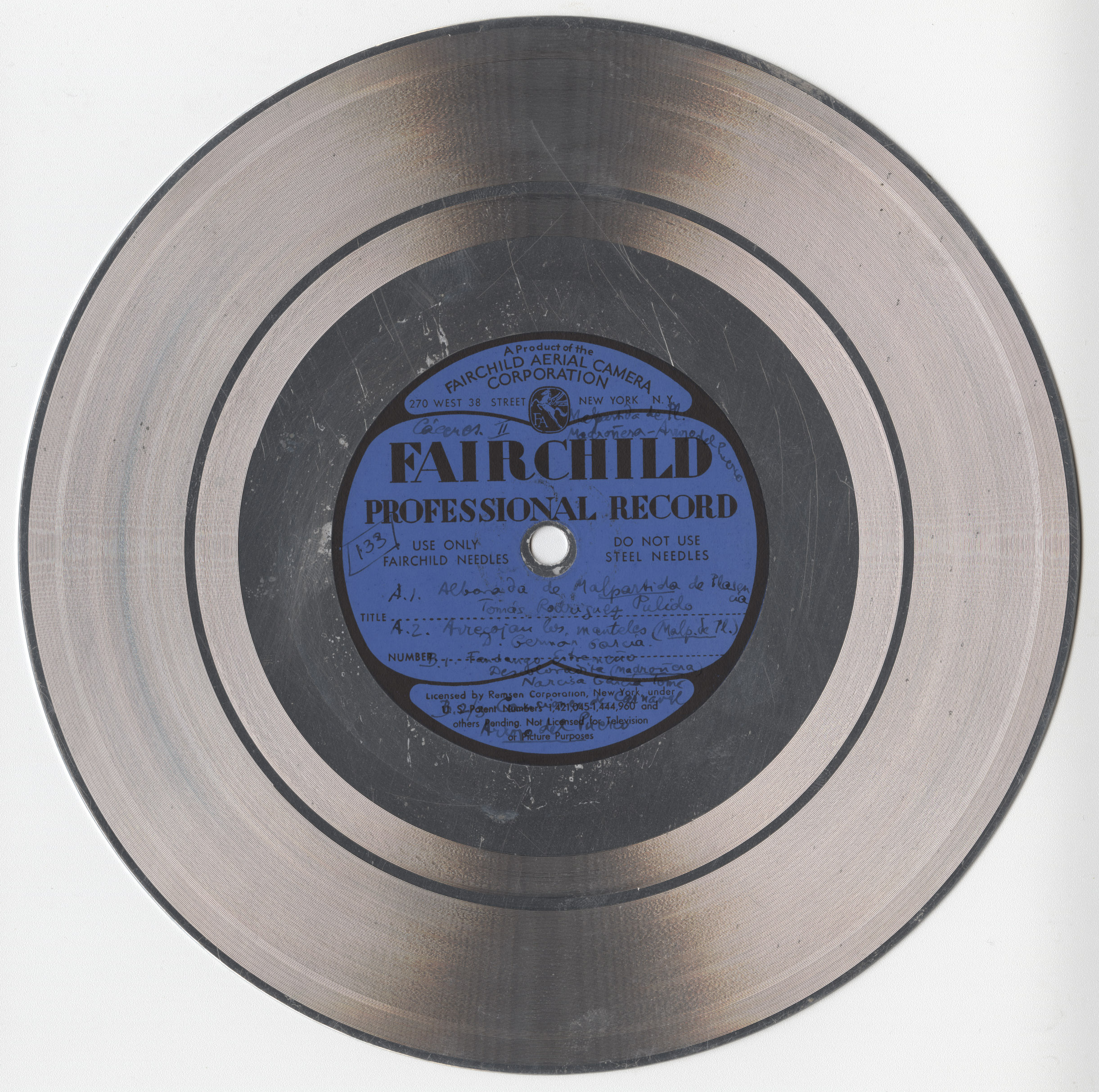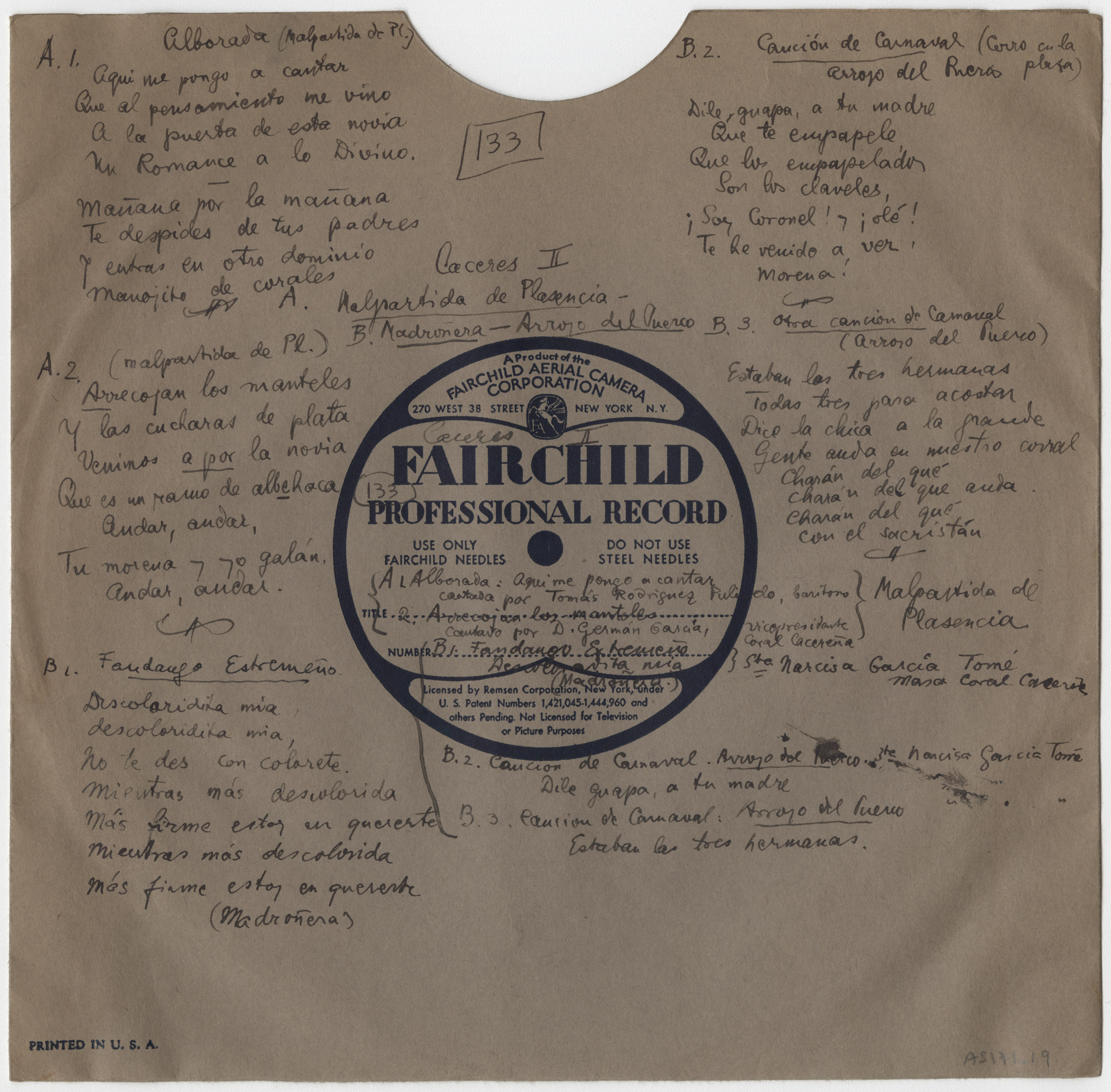 Descripción física: Disco de aluminio. En la pegatina del disco lleva manuscritos los lugares, los títulos de las canciones y los intérpretes. En el sobre, además, lleva las letras de las canciones.