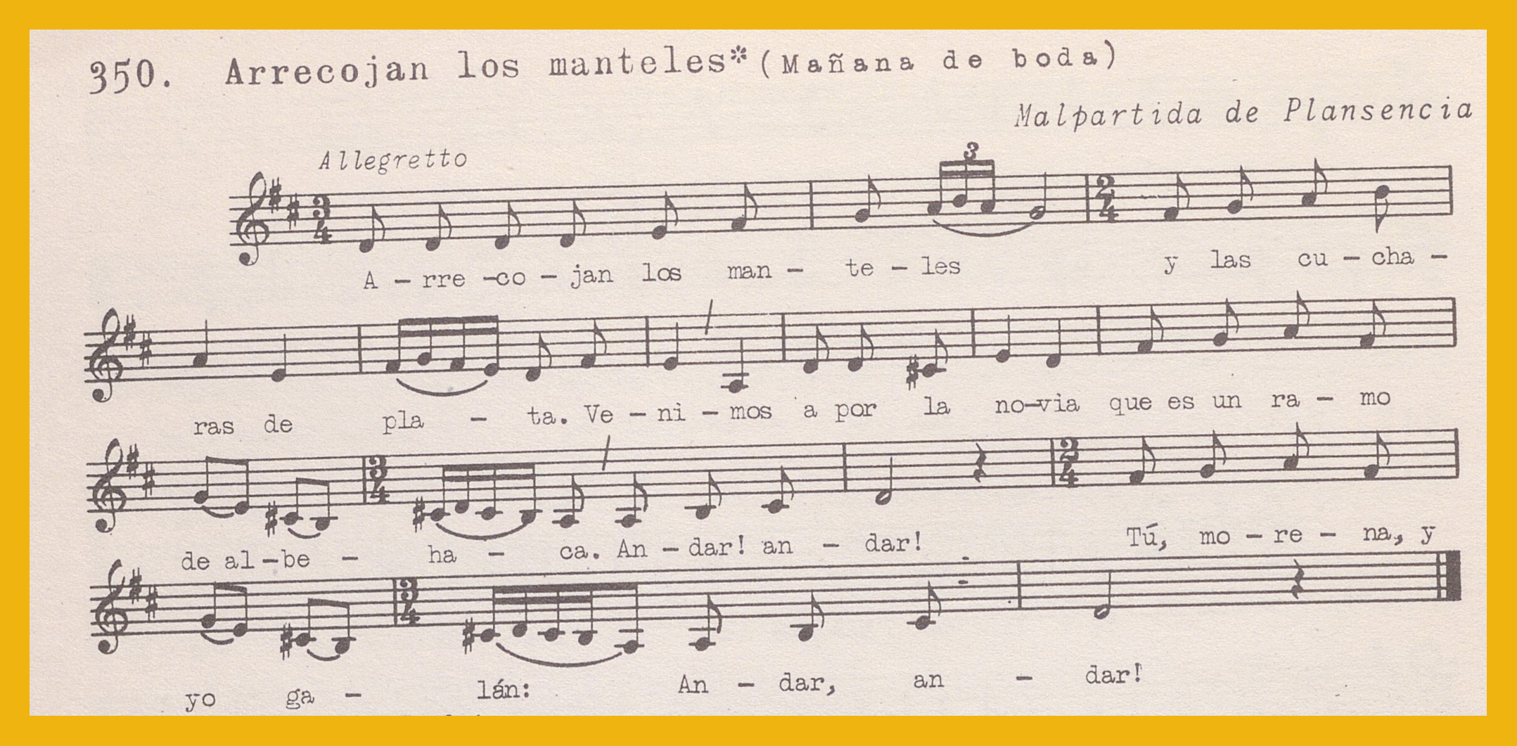 Ref. Partitura transcripción Kurt Schindler (1941): A: «Alborada», registro 349. «Arrecojan los manteles», registro 350. B: «Descoloridita mía» en el registro 344.«Dile guapa a tu madre» en el registro 229.«Estaban las tres hermanas» en el registro 2I4