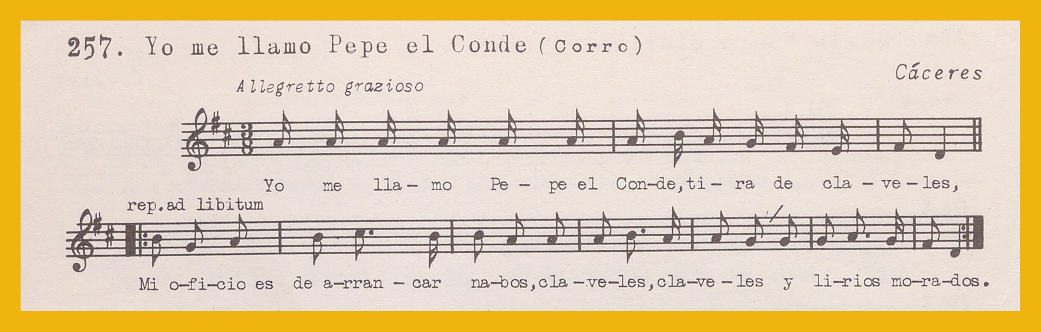 Ref. Partitura transcripción Kurt Schindler (1941): A: «Yo me llamo Pepe el Conde (Corro)», registro nº 257. B: Aparece como «Toquen tambores» en el registro nº 199; ; Sin registro de partitura; ; Aparece como «Al pasar por los torneos (Romance) o La Cristiana cautiva» en el registro nº 253.