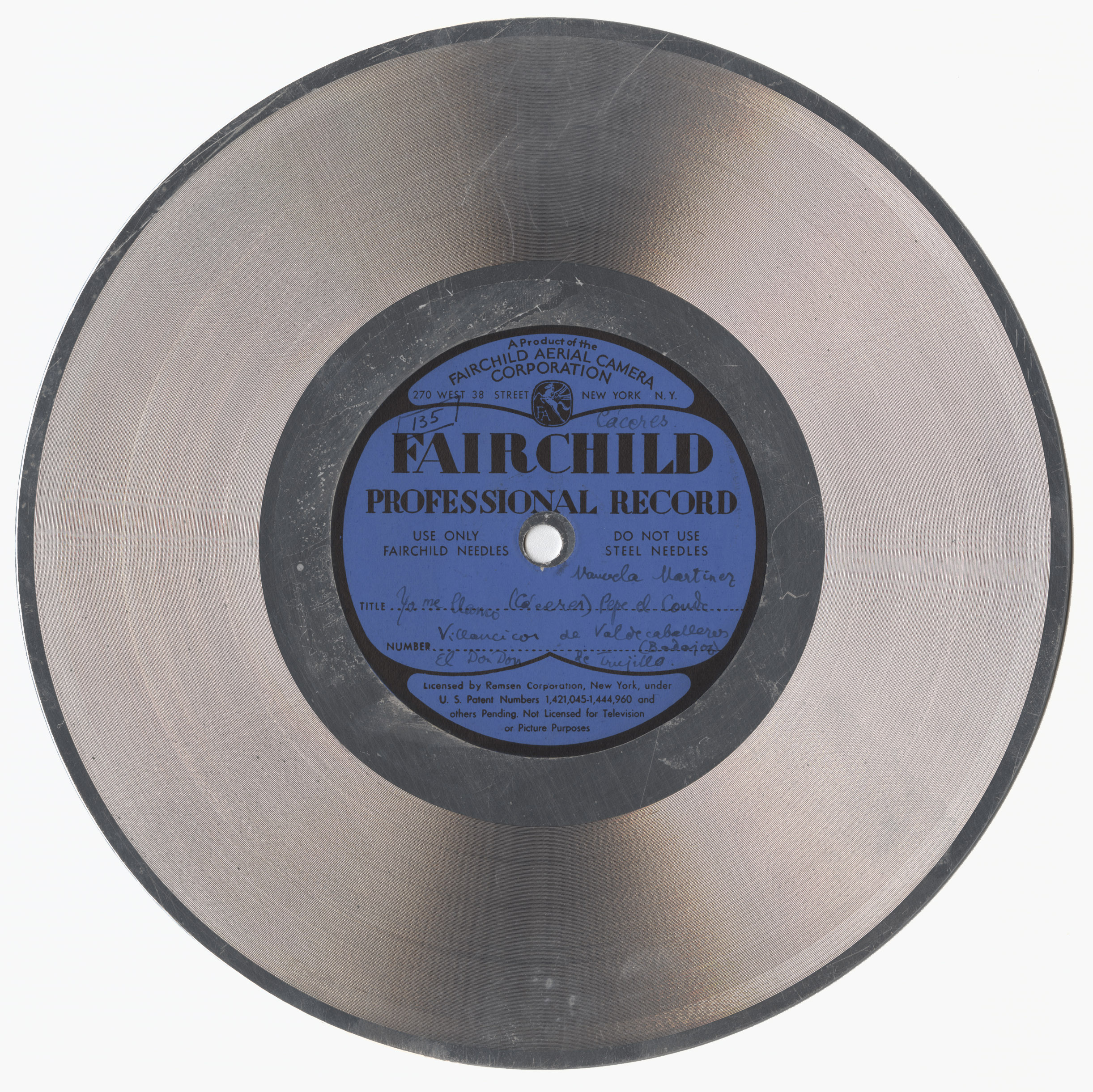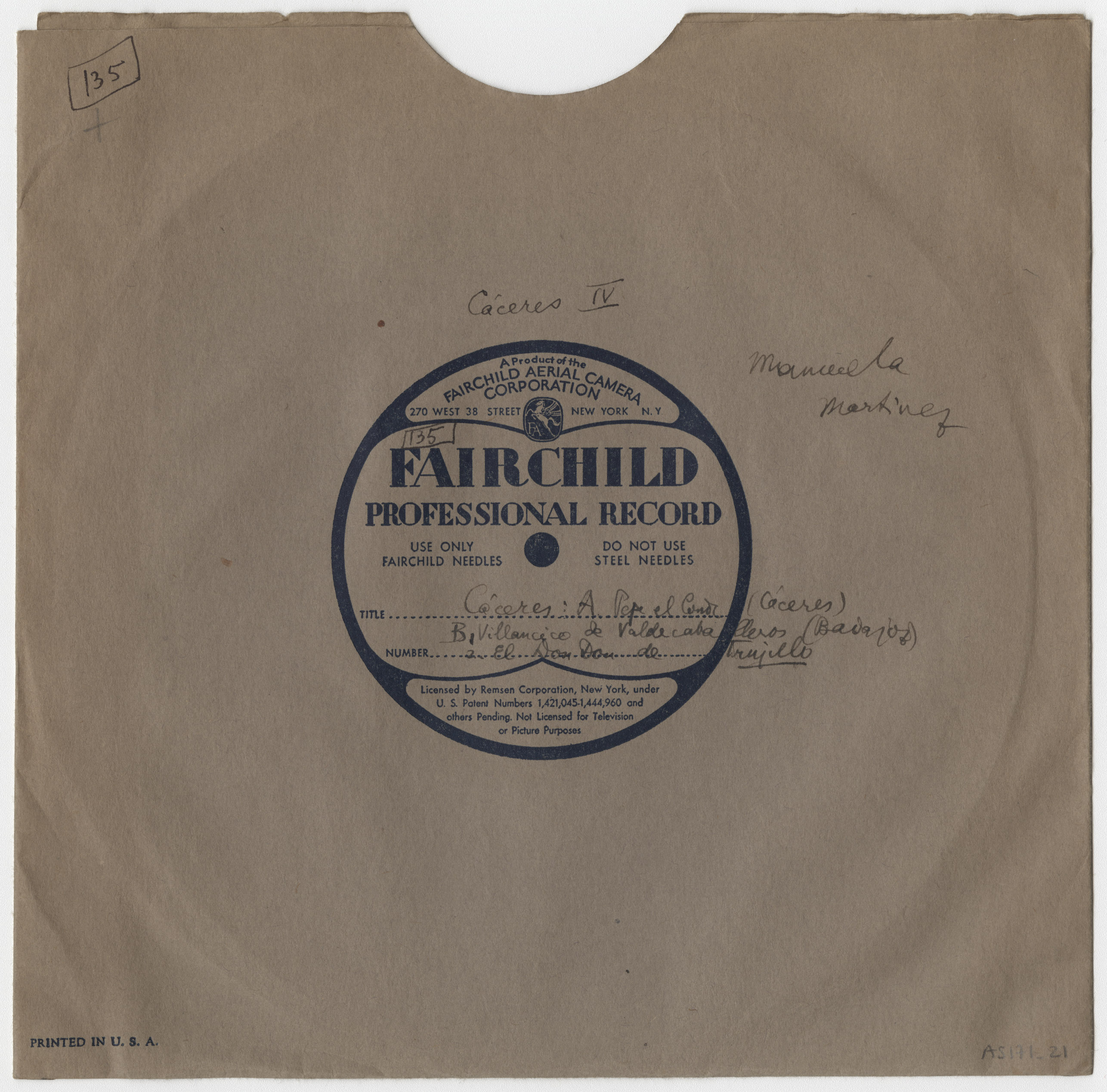 Descripción física: Disco de aluminio. Lugar, títulos de las canciones e intérprete, Manuela Martínez, están manuscritos en la pegatina del disco, al igual que en el sobre.