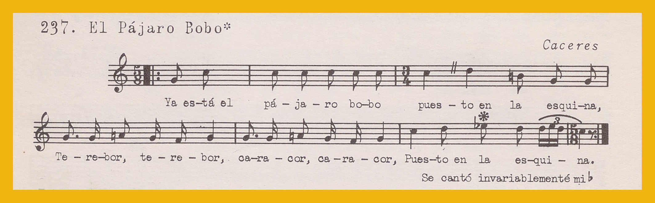 Ref. Partitura transcripción Kurt Schindler (1941): A. «El Sereno», registro nº 236. «El pájaro bobo», registro nº 237. B. Aparece como «Al gurugú», en el registro nº 238