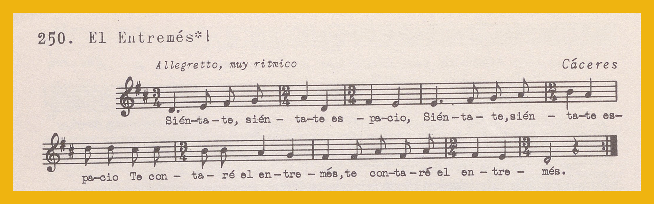 Ref. Partitura transcripción Kurt Schindler (1941): A. «El Entremés», registro nº 250. B. " Camino de Trujillo" aparece como «Ay! Cógeme que me caigo», registro nº 251. «La trujillanita», registro nº 252