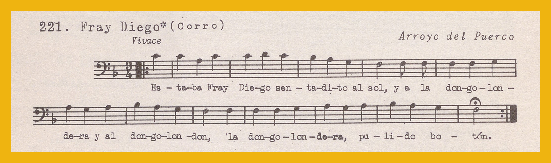 Ref. Partitura transcripción Kurt Schindler (1941): A. «Fray Diego (Corro)», registro nº 221. «Estaba la Catalina (Corro)», registro nº 222.. B. Aparece como «La Dama y el galán (Romance)», registro nº 223