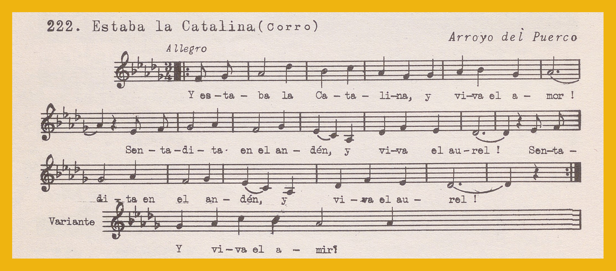 Ref. Partitura transcripción Kurt Schindler (1941): A. «Fray Diego (Corro)», registro nº 221. «Estaba la Catalina (Corro)», registro nº 222.. B. Aparece como «La Dama y el galán (Romance)», registro nº 223