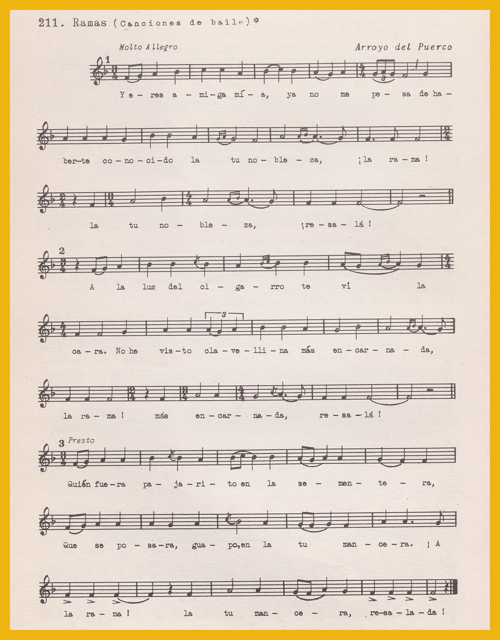 Ref. Partitura transcripción Kurt Schindler (1941): A. «La jeringosa (canción de baile)», registro nº 273. B. «Ramas (Canciones de baile)», registro nº 211. «Llanas (Canciones de baile», registro nº 212