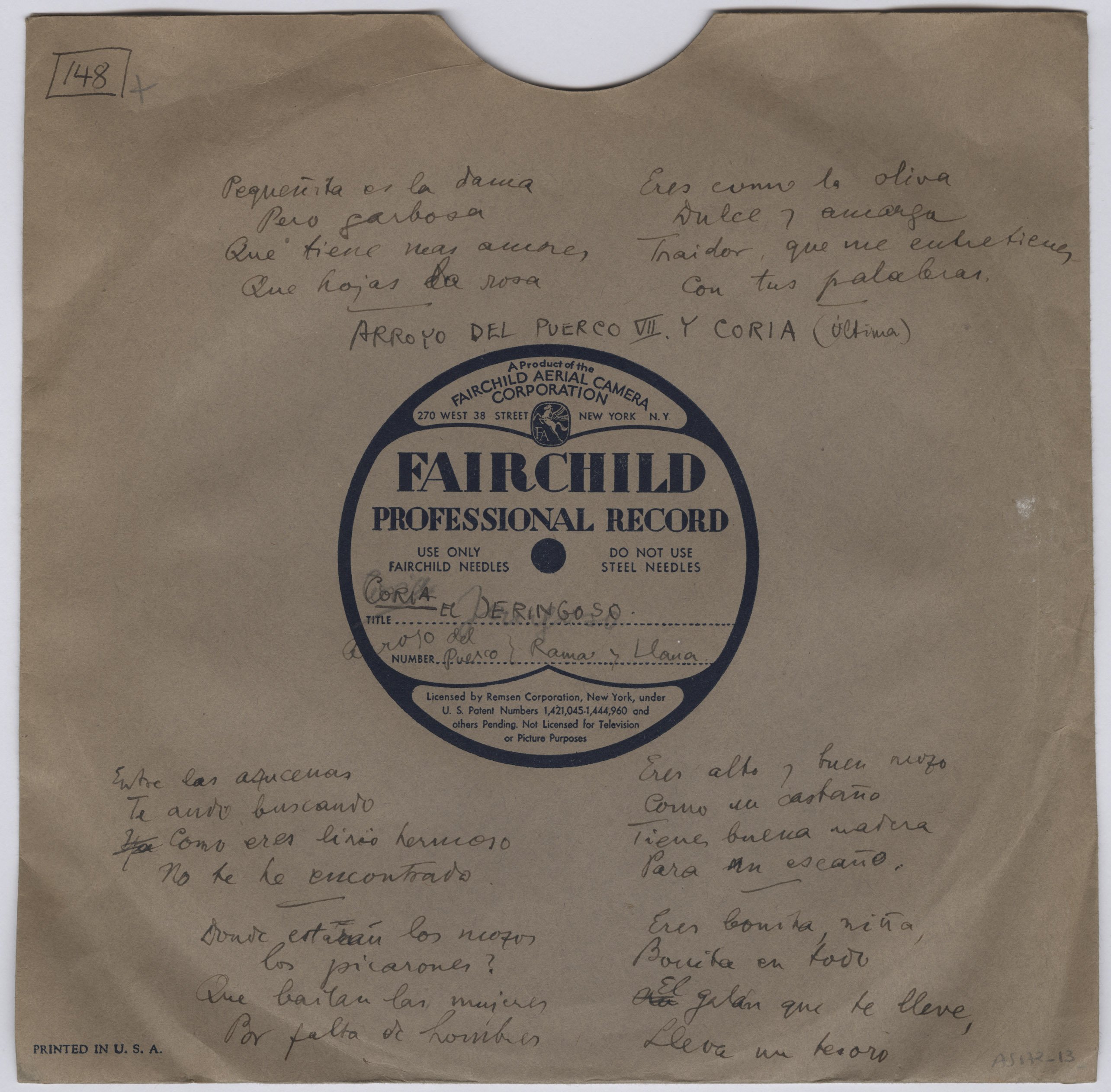 Descripción física: Disco de aluminio. La etiqueta del disco lleva manuscritos los lugares, los títulos de las canciones y " Cantares bailables de Arroyo del Puerco" . En el sobre, además, lleva la letra de Ramas y Llanas.