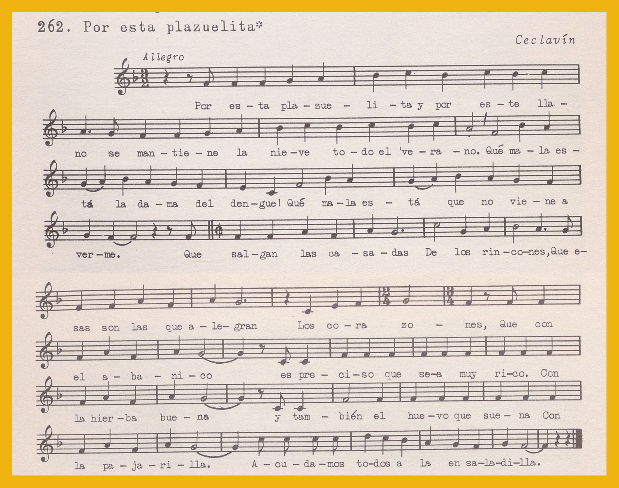 Ref. Partitura transcripción Kurt Schindler (1941): A. «Campanillos de plata», registro nº 258. «El clavel en el huerto», registro nº 260. B. «El quiriquirí», registro nº 261. «Por esta plazuelita», registro nº 262