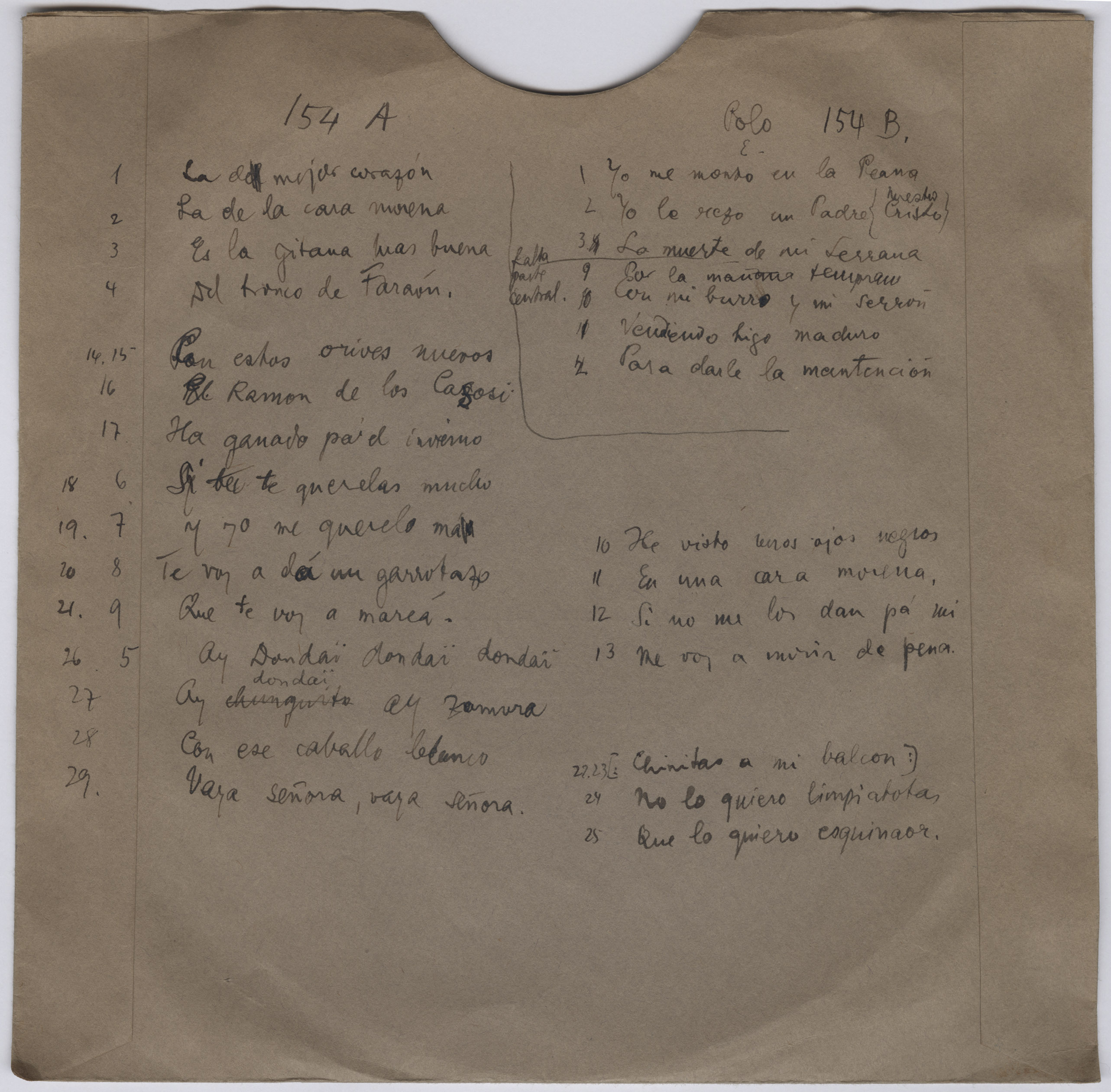 Descripción física: Disco de aluminio. En la etiqueta del disco están anotados el lugar y los títulos de las canciones. En el sobre las letras y las intérpretes: Felisa Molina y guitarra Ana Molina (de la primera).
