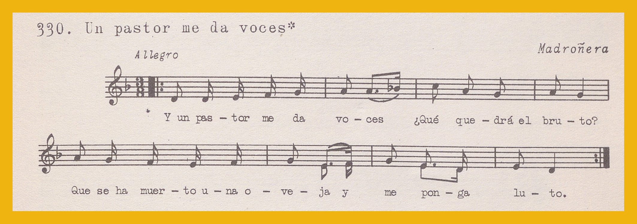Ref. Partitura transcripción Kurt Schindler (1941): A. «Las tres pastoras (Romance)», registro nº 329. «Un pastor me da voces», registro nº 330. B. «Paseaba el Conde Niño (Romance)», registro nº 331. «La cigüeña y la culebra», registro nº 332 y 333