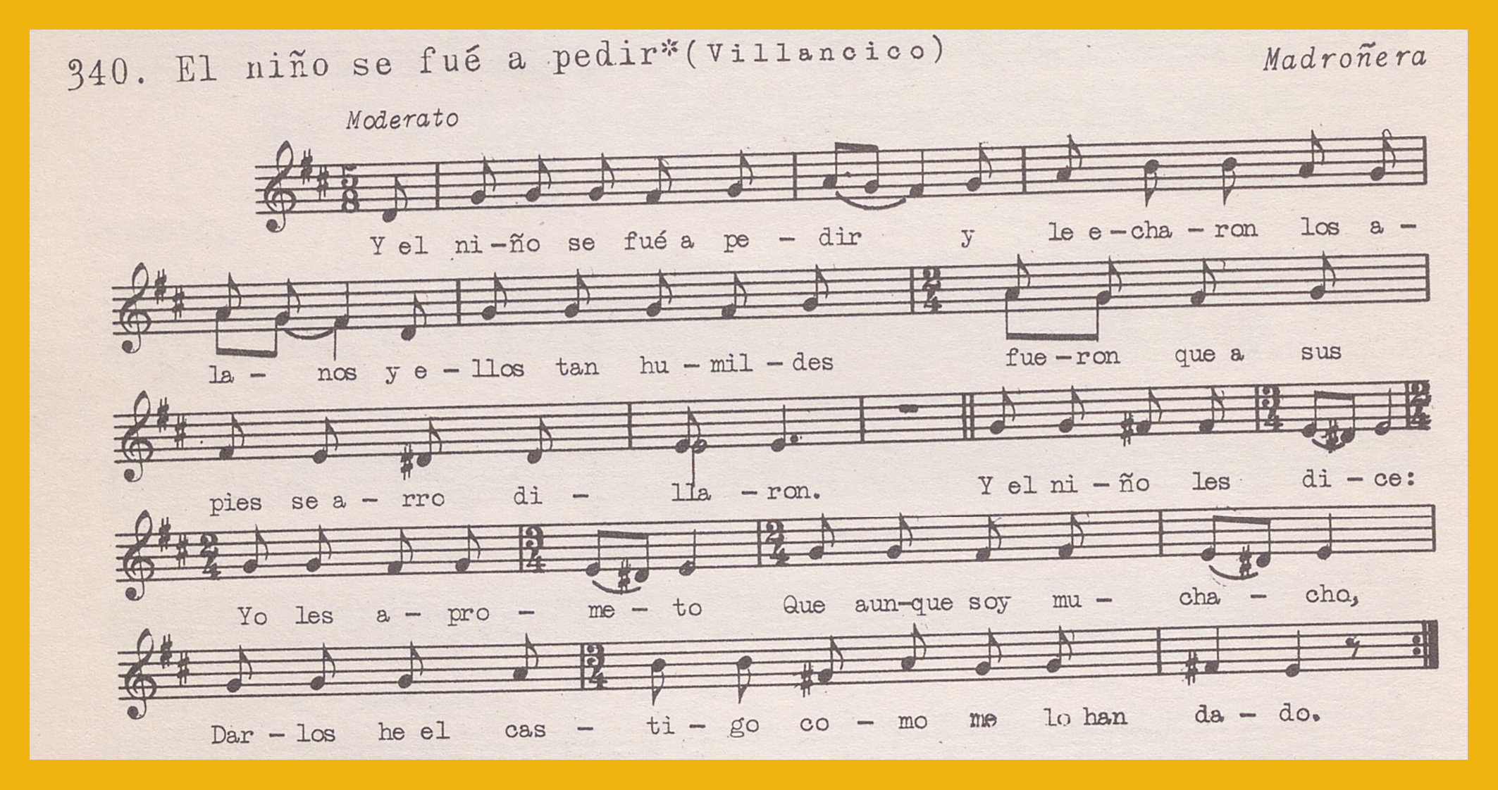 Ref. Partitura transcripción Kurt Schindler (1941): A. «El Pájaro bobo», registro nº 338. " Ay el inglés" aparece como «Esta es la tonada nueva», registro nº 339. B. «El niño se fue a pedir (Villancico)», registro nº 340. «Ay del chiquirritín (Villancico», registro nº 341