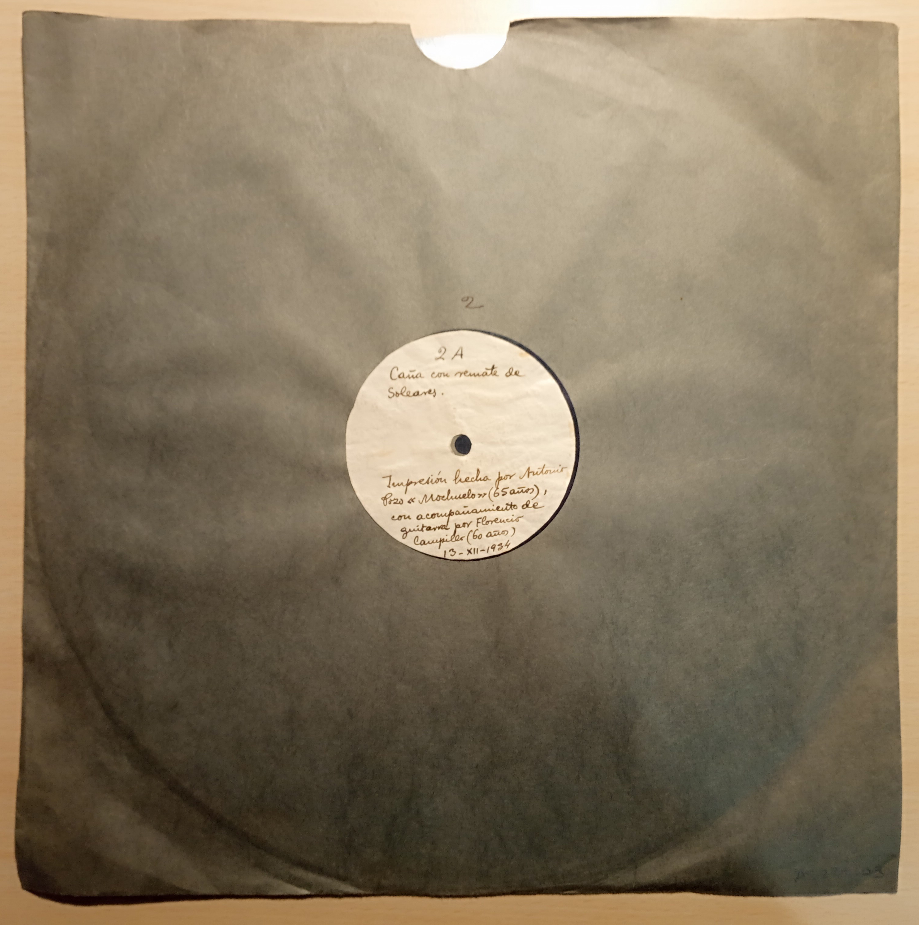 Disco 162 (2A). "Caña con remate de soleares. Impresiones hechas por Antonio Pozo ""El Mochuelo"" (65 años) con acompañamiento de guitarra por Florencio Campillo (60 años) (13-XII-1934).". Cara B