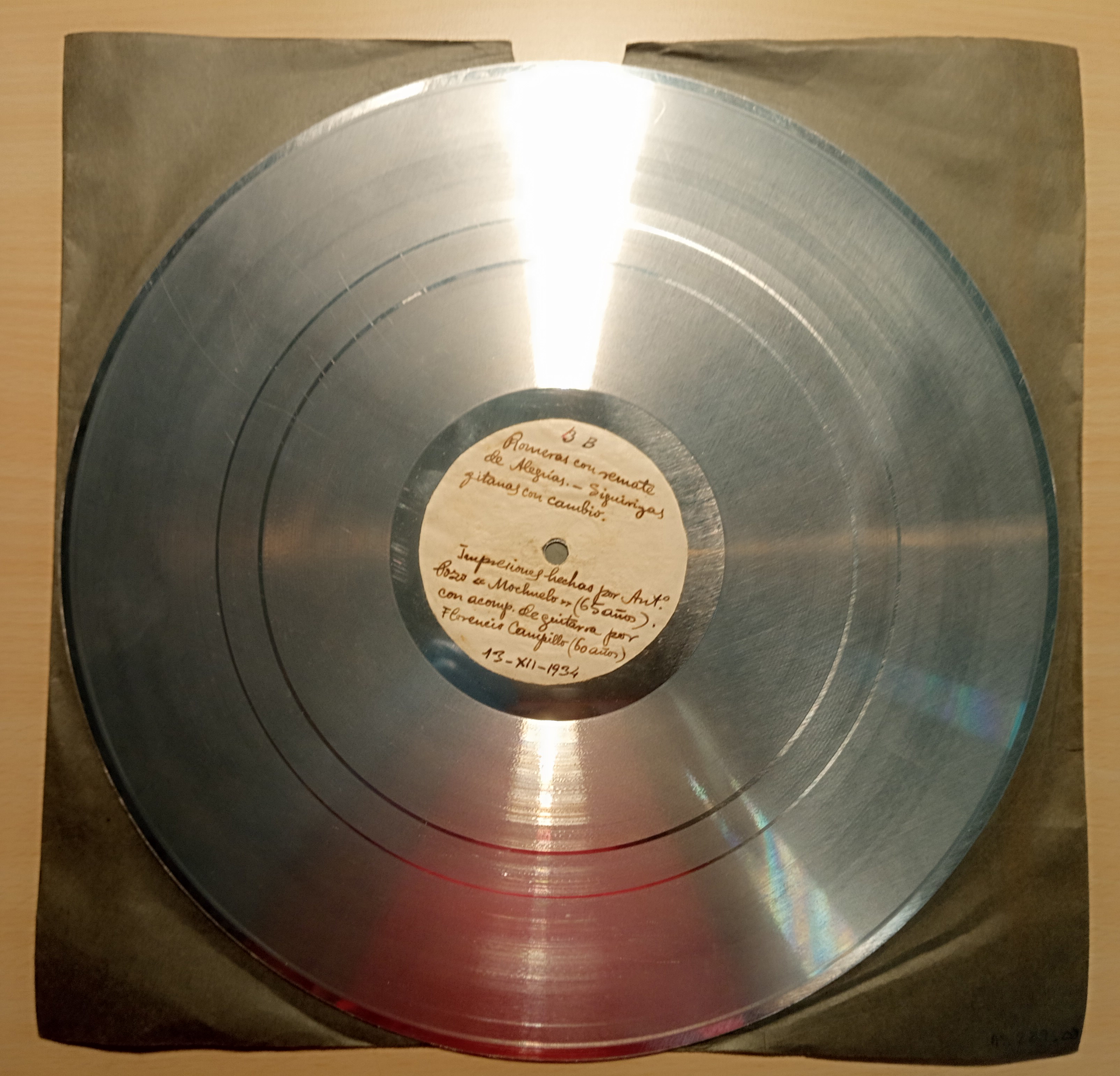 Descripción física: Disco de aluminio. La etiqueta pegada en el disco está manuscrita: " 3B. Romeras con remate de alegrías-Siguiriyas gitanas con cambio. Impresiones hechas por Antonio Pozo " El Mochuelo" (65 años) con acompañamiento de guitarra por Florencio Campillo (60 años) (13-XII-1934). Aunque las grabaciones se corresponden con discursos.
