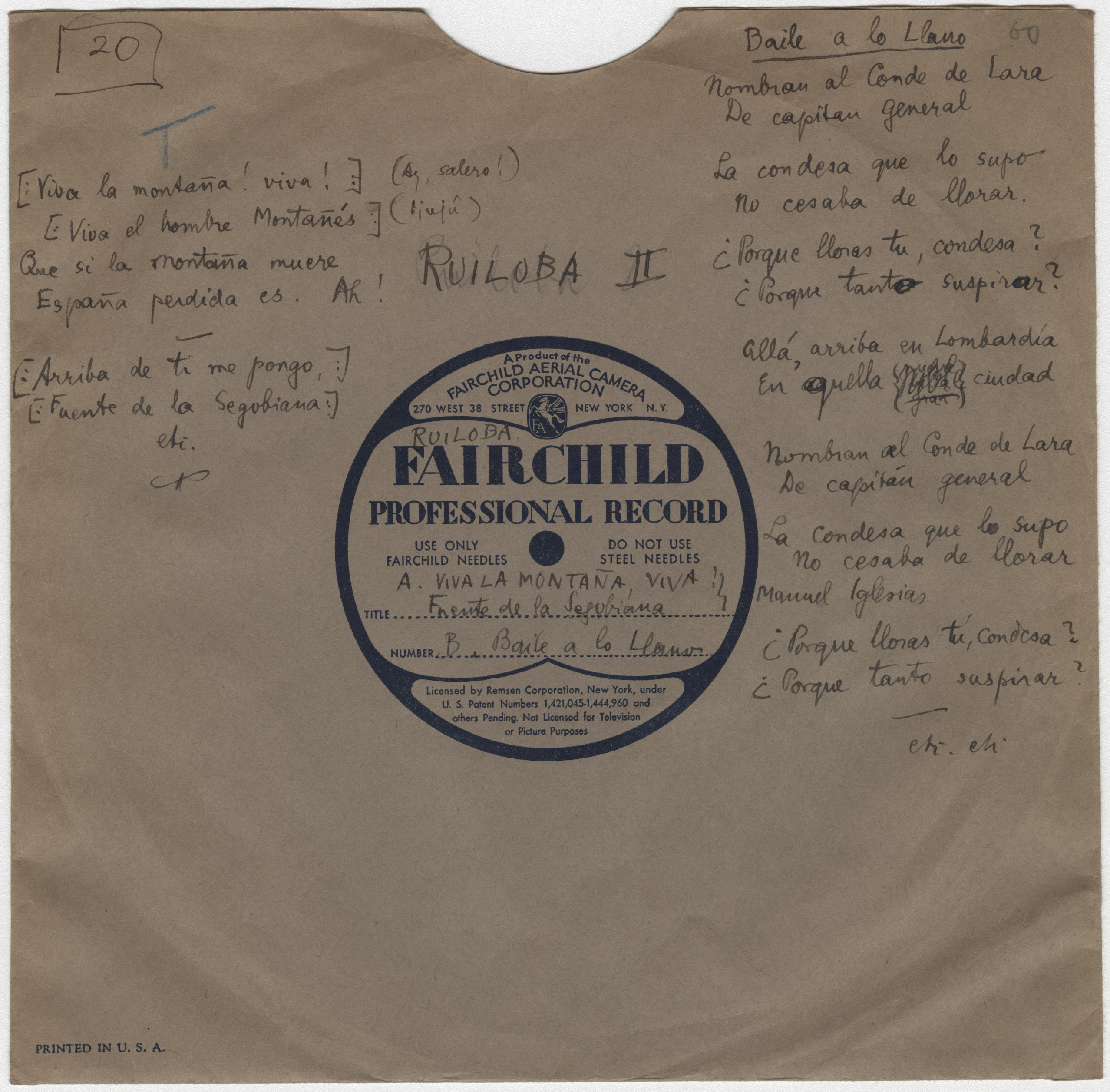 Descripción física: Disco de aluminio. En la pegatina del disco lleva escritos el lugar, los títulos de las canciones y el intérprete, Manuel Iglesias. En el sobre, además de esta información, recoge estrofas de las dos primeras canciones y la letra de Baile a lo Llano.