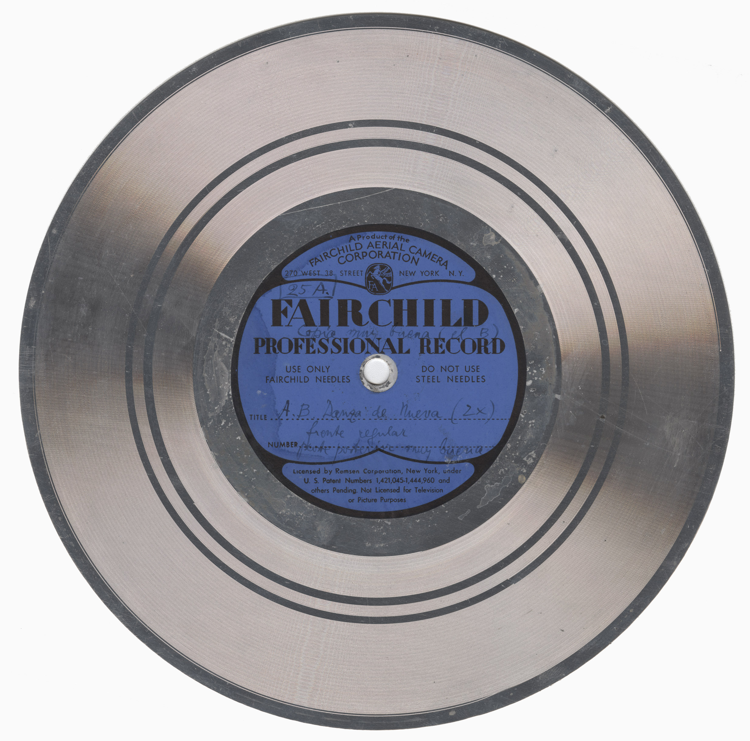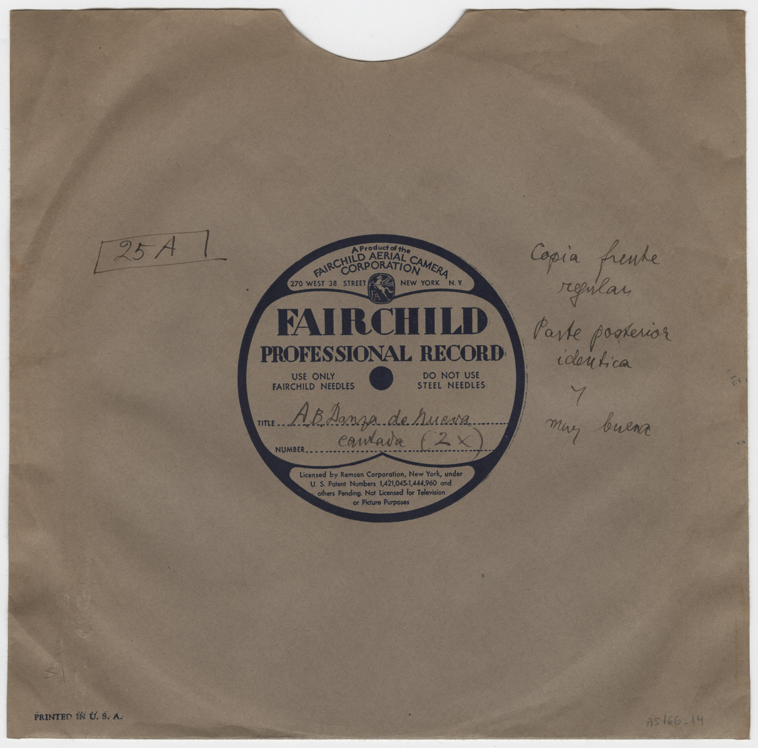 Descripción física: Disco de aluminio. En la etiqueta del disco lleva escrito el título y anotado: " copia muy buena (el B). Frente regular pero posterior muy buena" . En el sobre lleva manuscrita la misma información: " Copia frente regular, parte posterior idéntica y muy buena" .