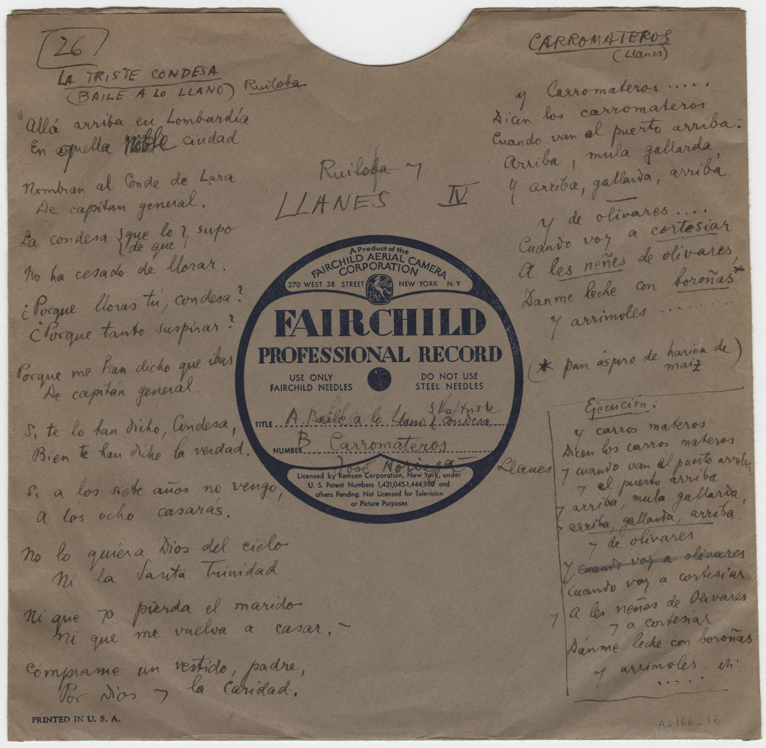 Descripción física: Disco de aluminio. En la etiqueta del disco lleva anotados los lugares, los títulos de las canciones y el intérprete de Carromateros, José Noriega. En el sobre, además, lleva manuscrita la letra de las canciones.