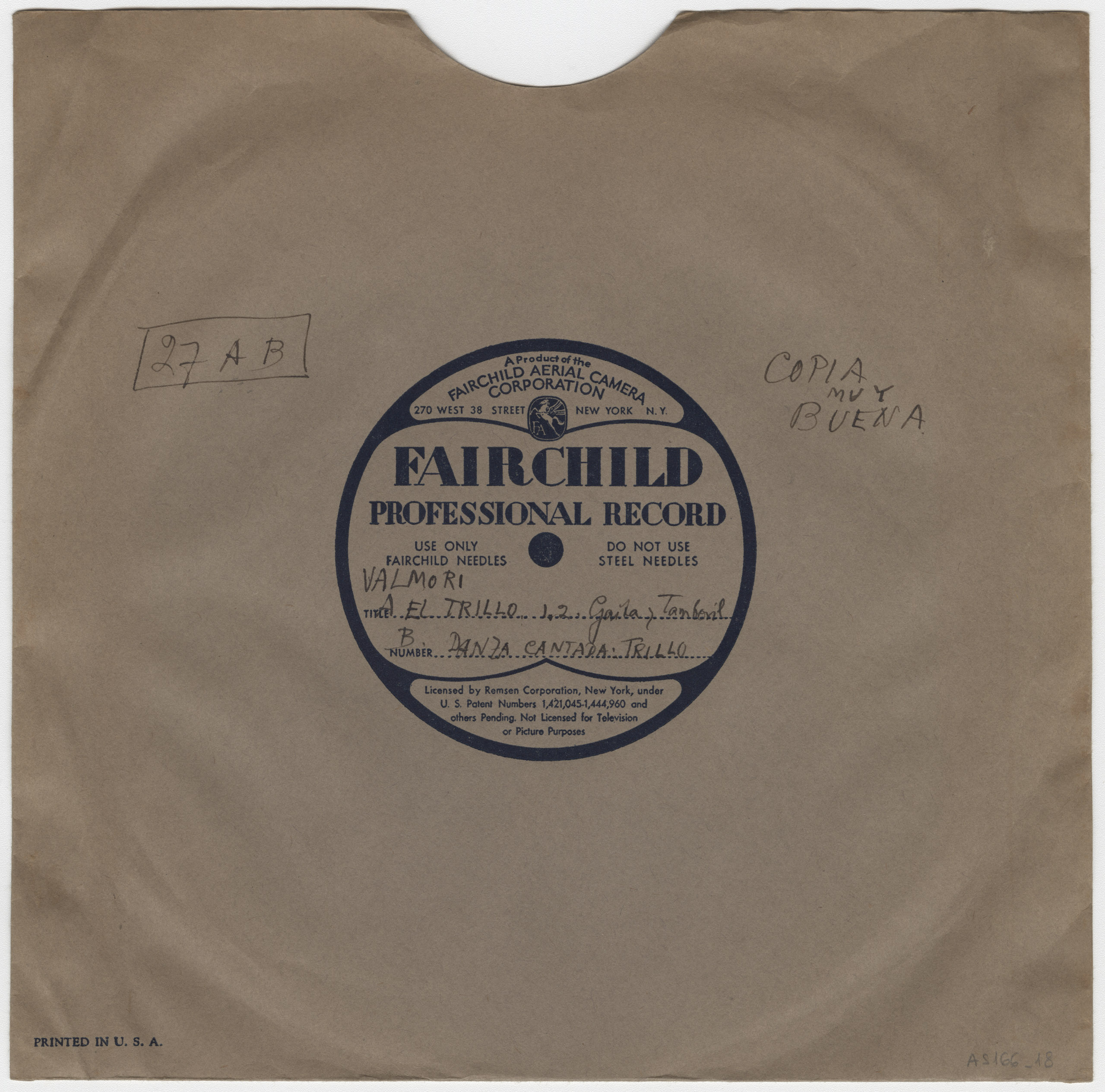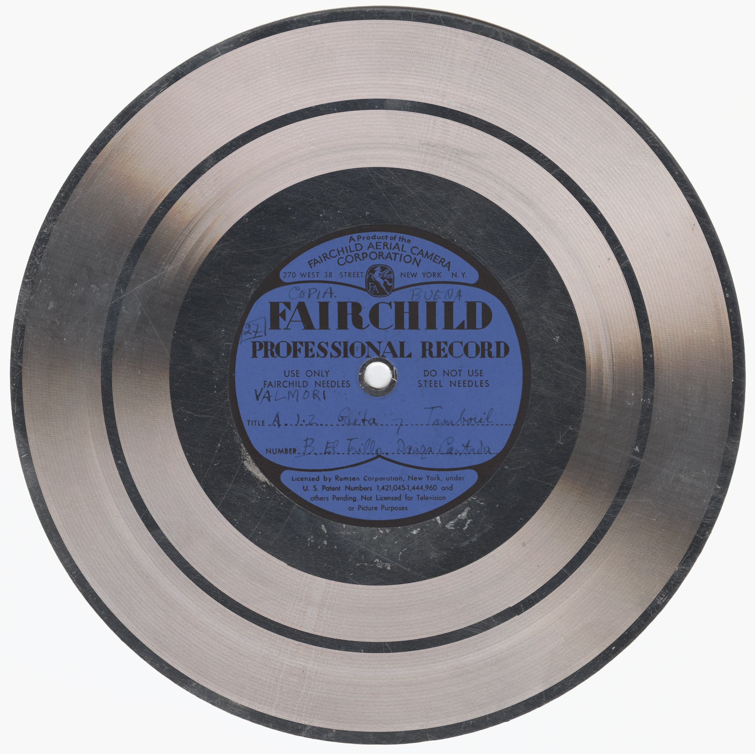 Marca comercial: Fairchild Professional Record (Fairchild Aereal Camera Corporation, New York).