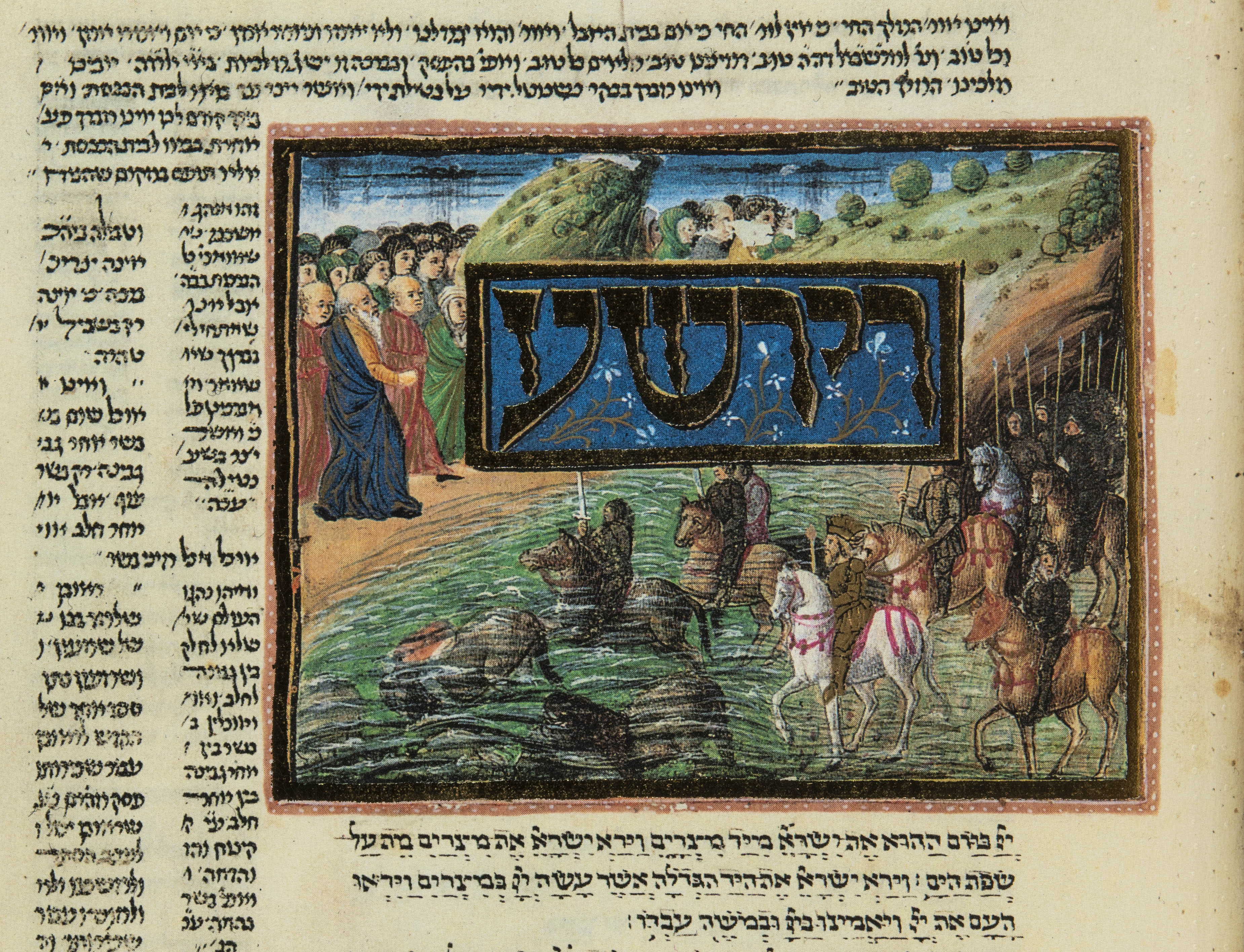 La ilustración del episodio de la muerte de los recién nacidos que se relata en el libro de Éxodo (Ex 1,22) acompaña los textos que se leen durante la fiesta de la Pascua. En ella aparecen tres hombres porque, según la tradición judía, el faraón consultó su decisión de acabar con los primogénitos con tres consejeros. La escena recuerda a las imágenes de la matanza de los inocentes en la iconografía cristiana.