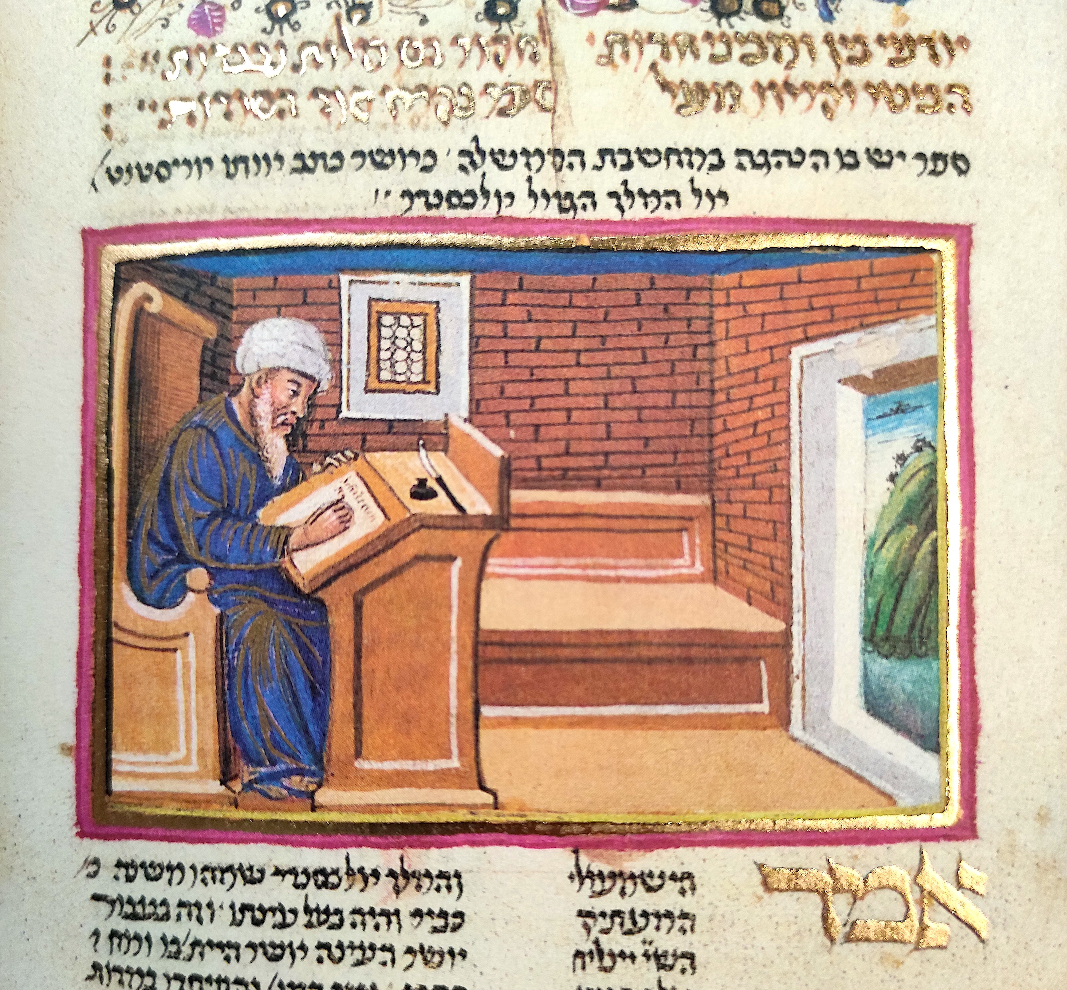 Entre los textos filósofos de la Miscelánea hay que destacar la traducción hebrea del Libro del secreto de los secretos, una de las obras más famosas atribuidas a Aristóteles en la Edad Media y que gozó de gran popularidad. Se pensaba que la había escrito el filósofo griego para entregarla a Alejandro Magno, después de terminar sus conquistas por Oriente. En el libro, el autor aconsejaba al emperador cómo debía organizar un imperio tan extenso y también le indicaba cómo moldear su propia personalidad, cultivando sus virtudes y comportándose de manera justa y conforme a la ética. La traducción fue hecha por Yehudá al-Harizi en el s. XIII a partir de la versión árabe y en la imagen se representa al filósofo anciano y sabio, vestido con ropas de color azul y ocre, escribiendo la obra.