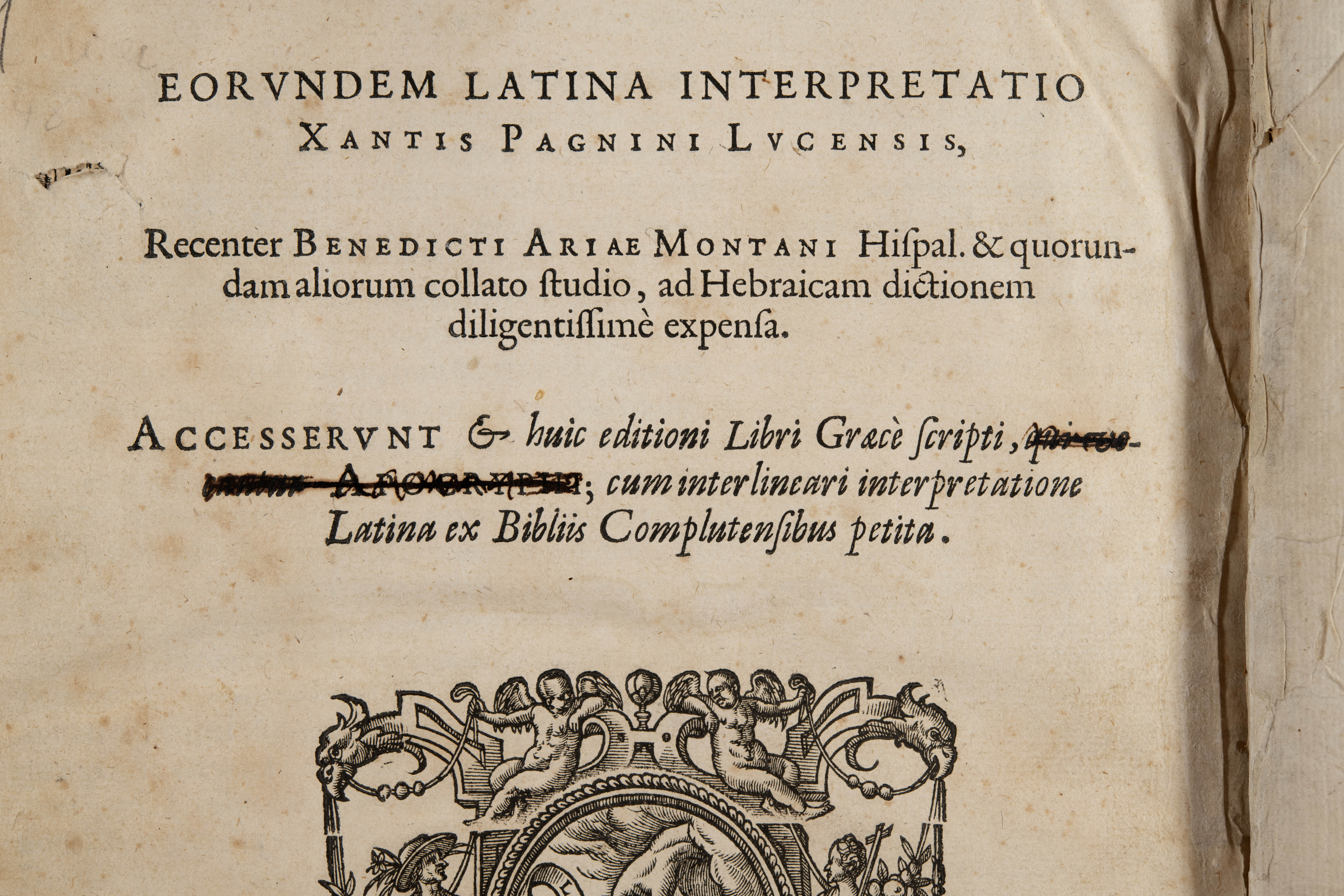 La traducción interlineal latina que acompaña al texto bíblico hebreo constituye, como señala el propio título de la obra, la revisión realizada por Benito Arias Montano (1527-1598) de la traducción del erudito dominico Santes Pagnino (ca. 1470-1541), publicada originalmente en 1528. Esta versión perfeccionada por Arias Montano había sido previamente incorporada en la Políglota de Amberes, la segunda biblia políglota española que dirigió el propio Arias Montano, continuando la tradición iniciada por la Biblia Poliglota Complutense del cardenal Cisneros (en concreto en el tomo VII, impreso en 1571; véase el ejemplar de la Biblioteca Nacional). En esta ocasión, sin embargo, el impresor Cristóbal Plantino la publicó de forma independiente, enriquecida con un segundo y nuevo prefacio escrito por Arias Montano bajo el título De varia Hebraicorum librorum scriptione et lectione commentatio. El ejemplar conservado en la BTNT corresponde precisamente a la primera edición de esta publicación autónoma, impresa en los talleres plantinianos de Amberes en 1584.