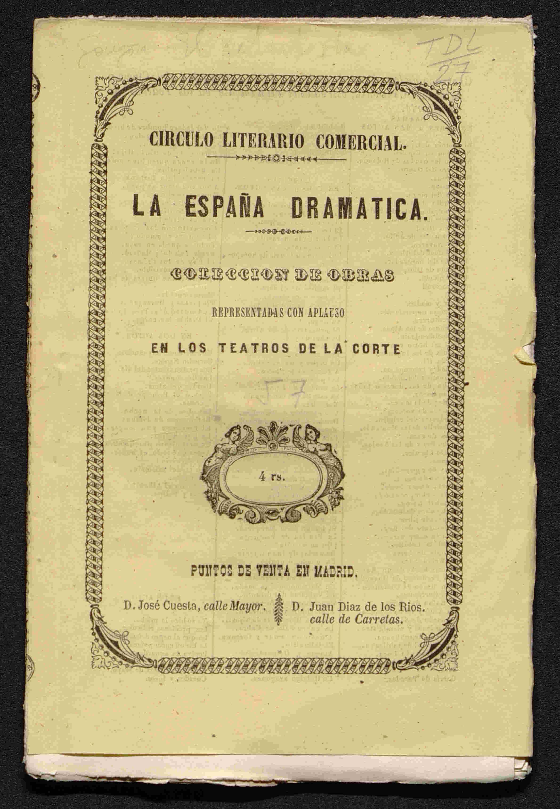 El precio de cada obra aparece impreso en la cubierta que la acompaña y por ello la colección de la BTNT cuenta con pocos ejemplos. Sin embargo, esta información puede ser localizada también en el Diccionario de Hidalgo (1973). Los casos en los que hemos podido comparar el precio de los ejemplares descritos en el Diccionario con los que aparecen en la biblioteca y conocer, además, el precio de dos o más ediciones de un mismo título, nos permiten ofrecer un primer acercamiento al precio de las obras teatrales del siglo XIX.